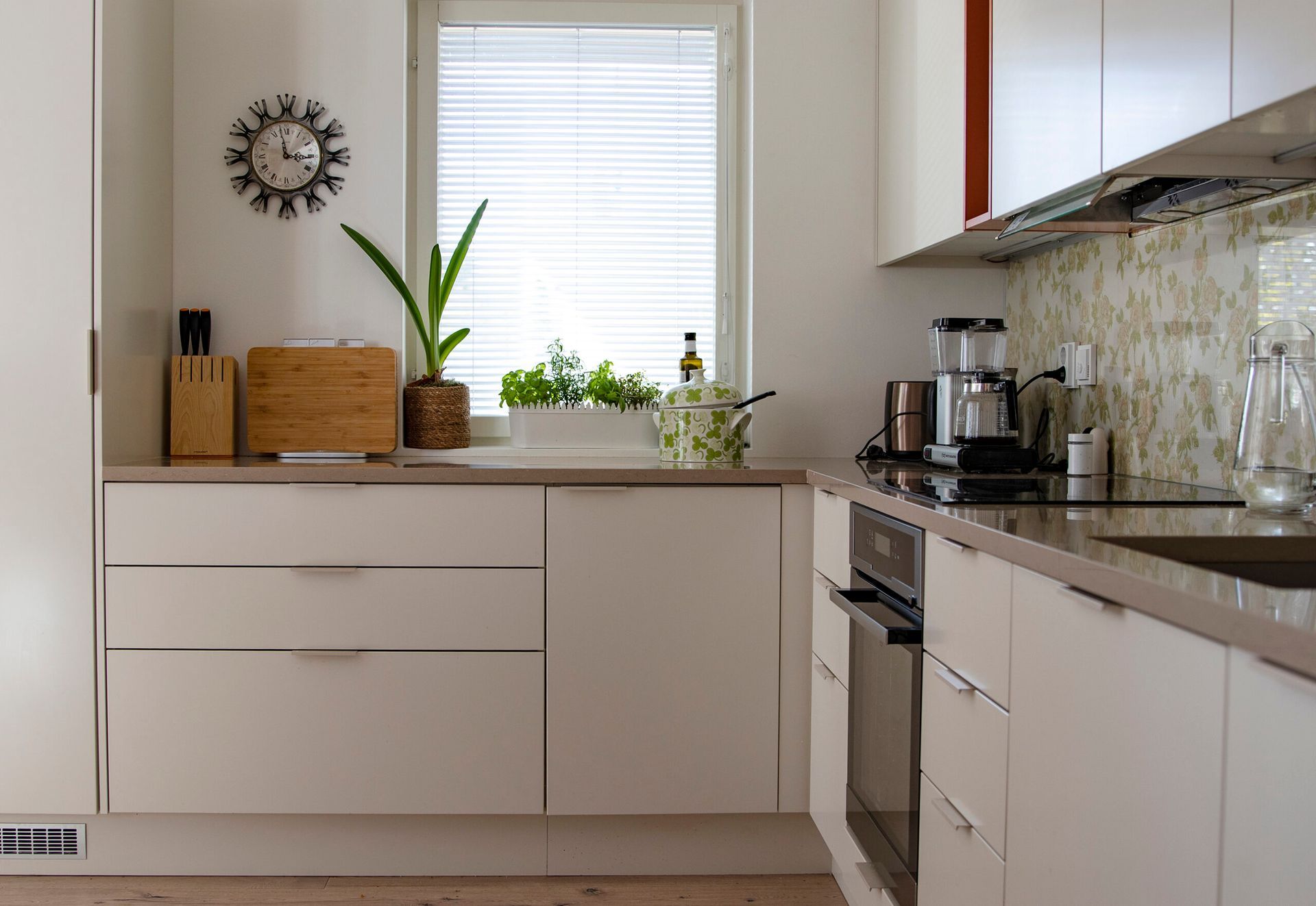 Vanhan 1900-luvun alkupuolella rakennetun puutalon kylpyhuone uusittiin täydellisesti remontissa. Toiminnot pysyivät entisillä paikoillaan, mutta tarkalla mitoituksella ja oivaltavalla kalustesuunnittelulla tilaan saatiin avaruutta ja lisää työtilaa. Rohkeat värit ja kuviot sopivat talon tyyliin ollen samalla arkea piristävä tekijä.