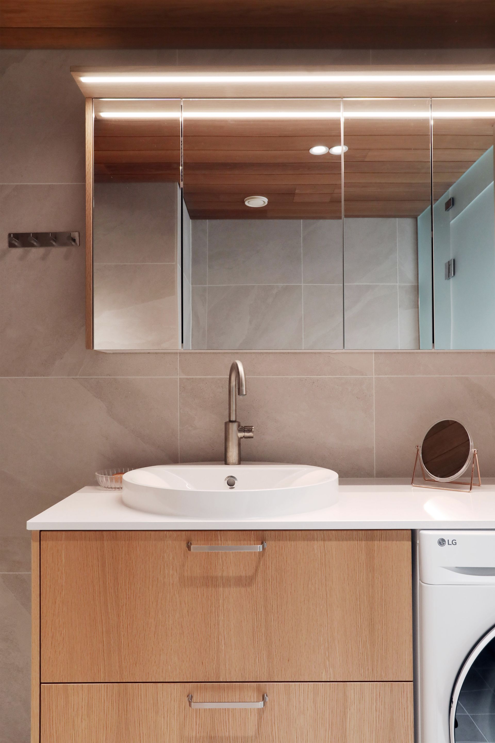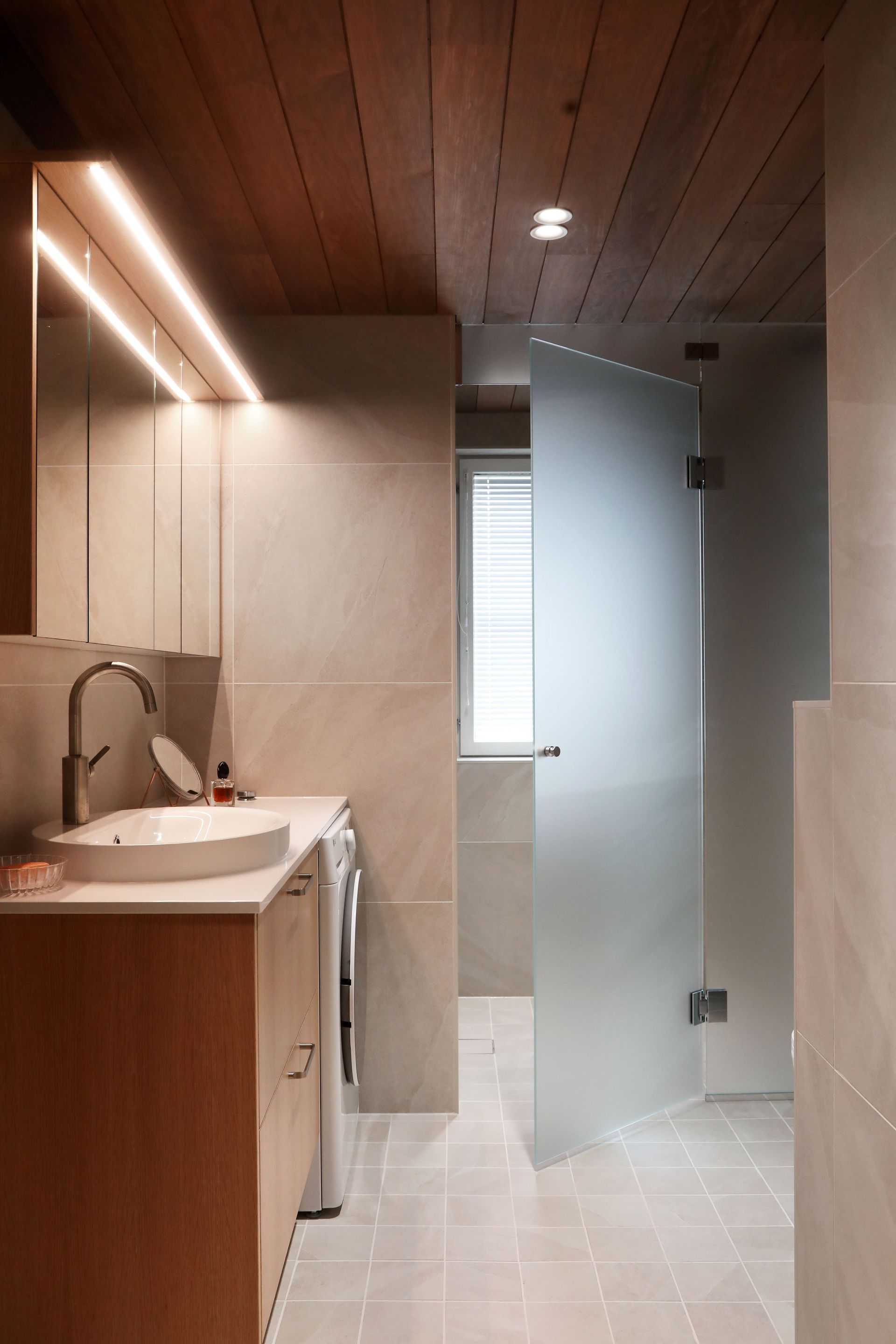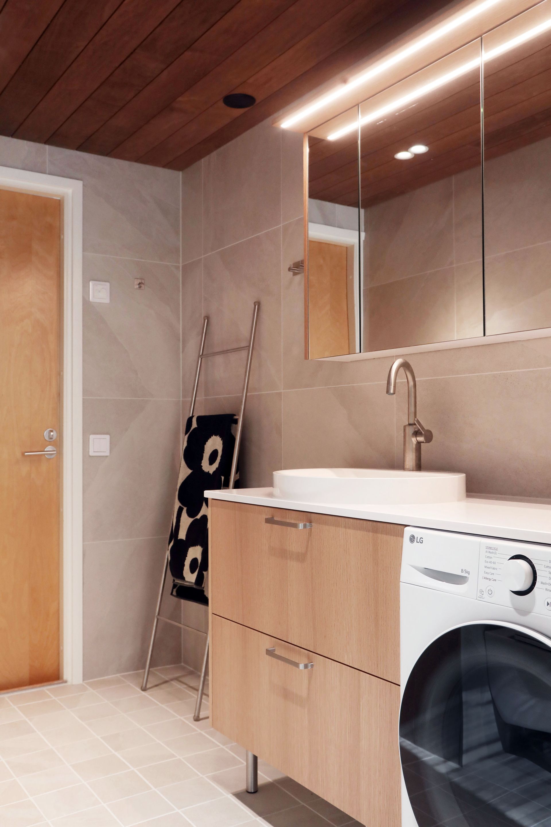 Vanhan 1900-luvun alkupuolella rakennetun puutalon kylpyhuone uusittiin täydellisesti remontissa. Toiminnot pysyivät entisillä paikoillaan, mutta tarkalla mitoituksella ja oivaltavalla kalustesuunnittelulla tilaan saatiin avaruutta ja lisää työtilaa. Rohkeat värit ja kuviot sopivat talon tyyliin ollen samalla arkea piristävä tekijä.