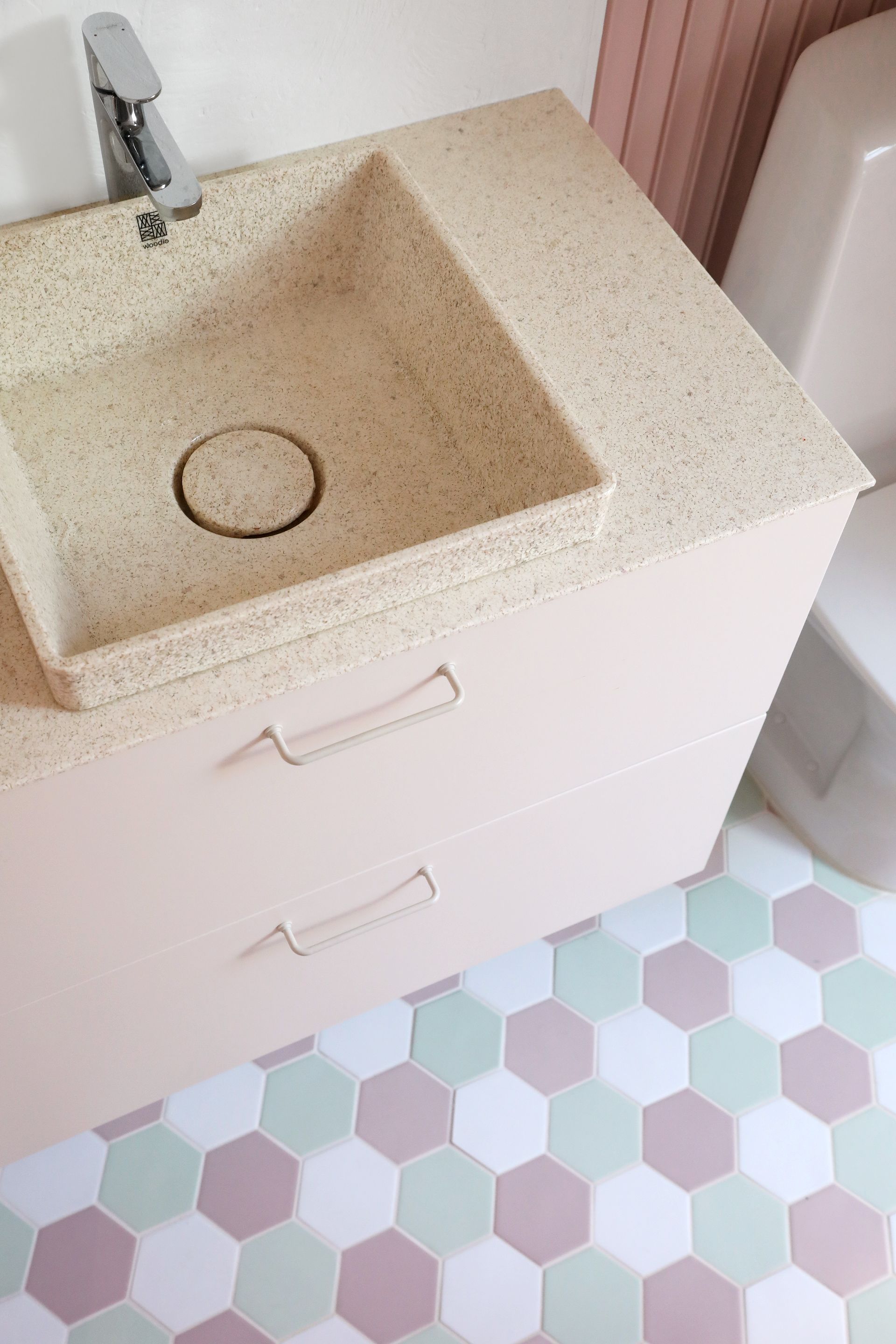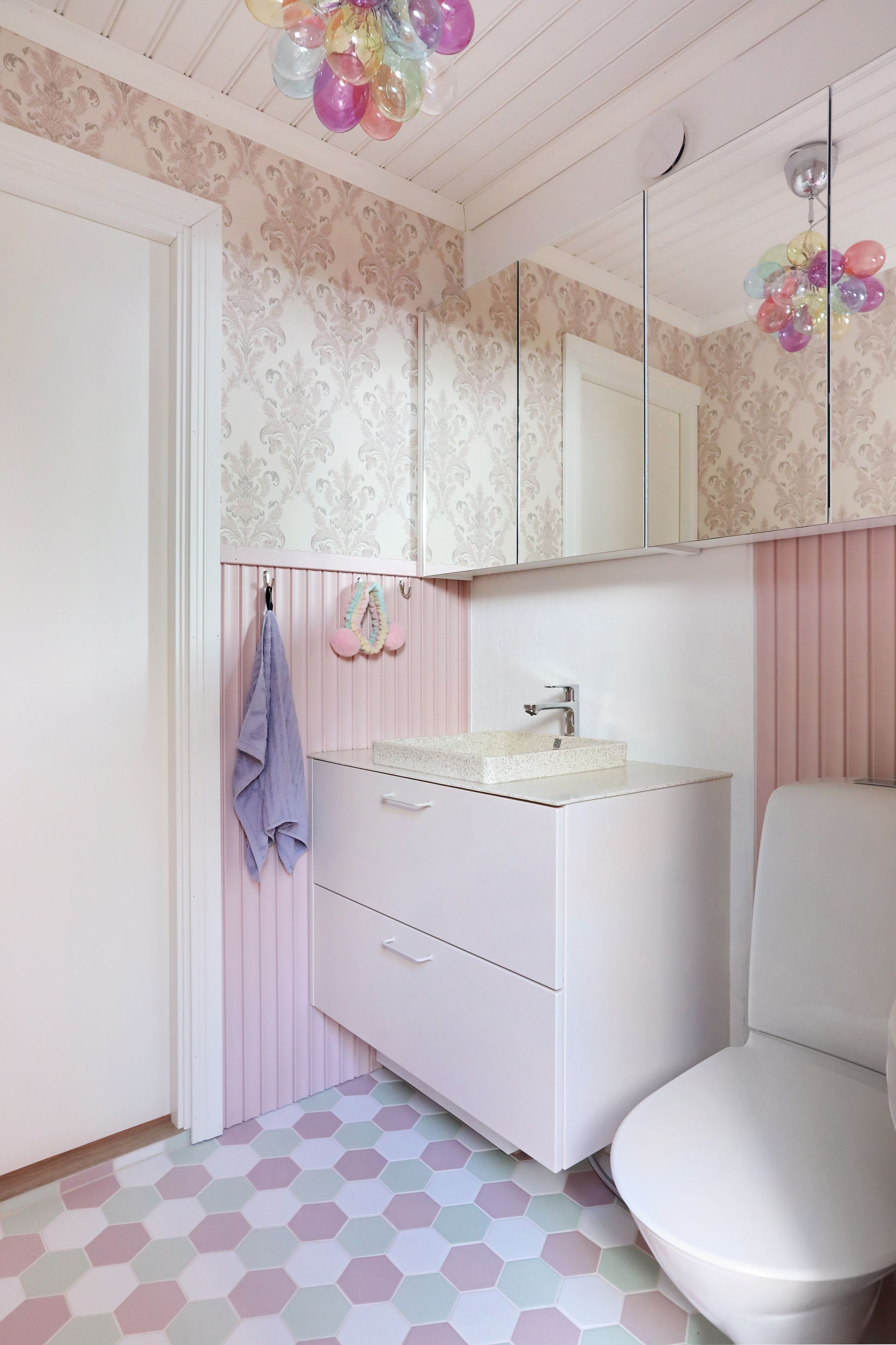 Vanhan 1900-luvun alkupuolella rakennetun puutalon kylpyhuone uusittiin täydellisesti remontissa. Toiminnot pysyivät entisillä paikoillaan, mutta tarkalla mitoituksella ja oivaltavalla kalustesuunnittelulla tilaan saatiin avaruutta ja lisää työtilaa. Rohkeat värit ja kuviot sopivat talon tyyliin ollen samalla arkea piristävä tekijä.