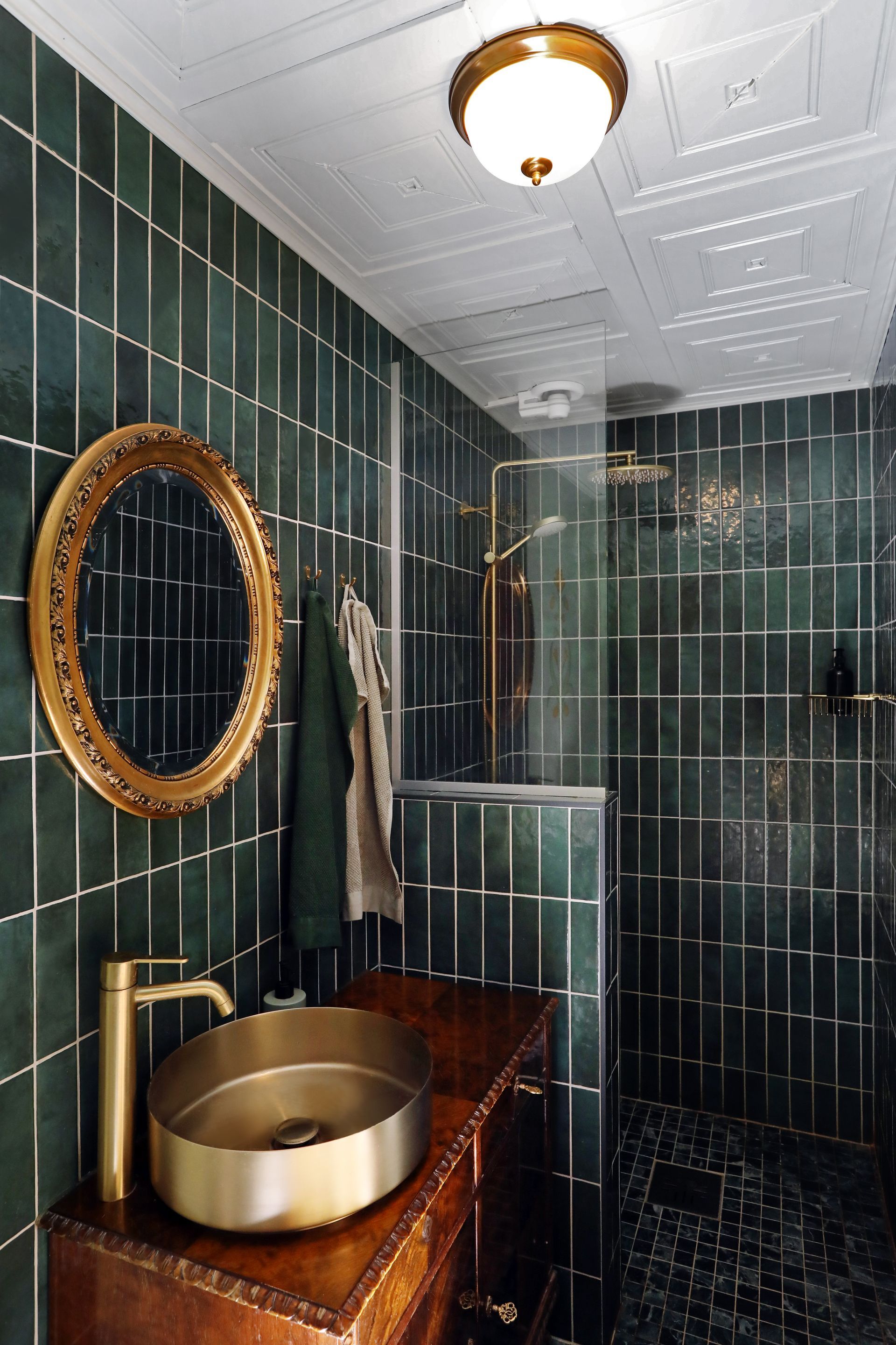 Vanhan 1900-luvun alkupuolella rakennetun puutalon kylpyhuone uusittiin täydellisesti remontissa. Toiminnot pysyivät entisillä paikoillaan, mutta tarkalla mitoituksella ja oivaltavalla kalustesuunnittelulla tilaan saatiin avaruutta ja lisää työtilaa. Rohkeat värit ja kuviot sopivat talon tyyliin ollen samalla arkea piristävä tekijä.
