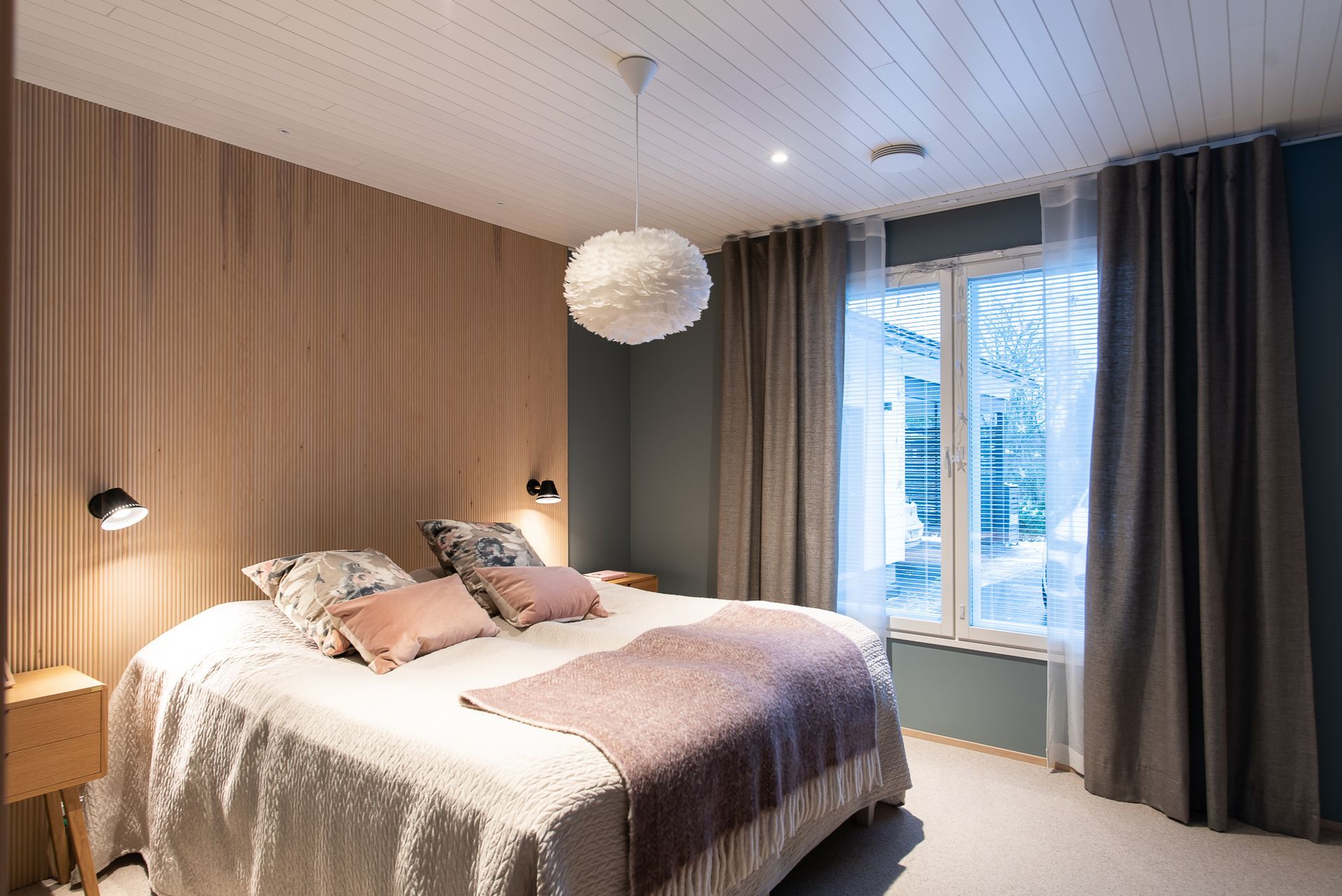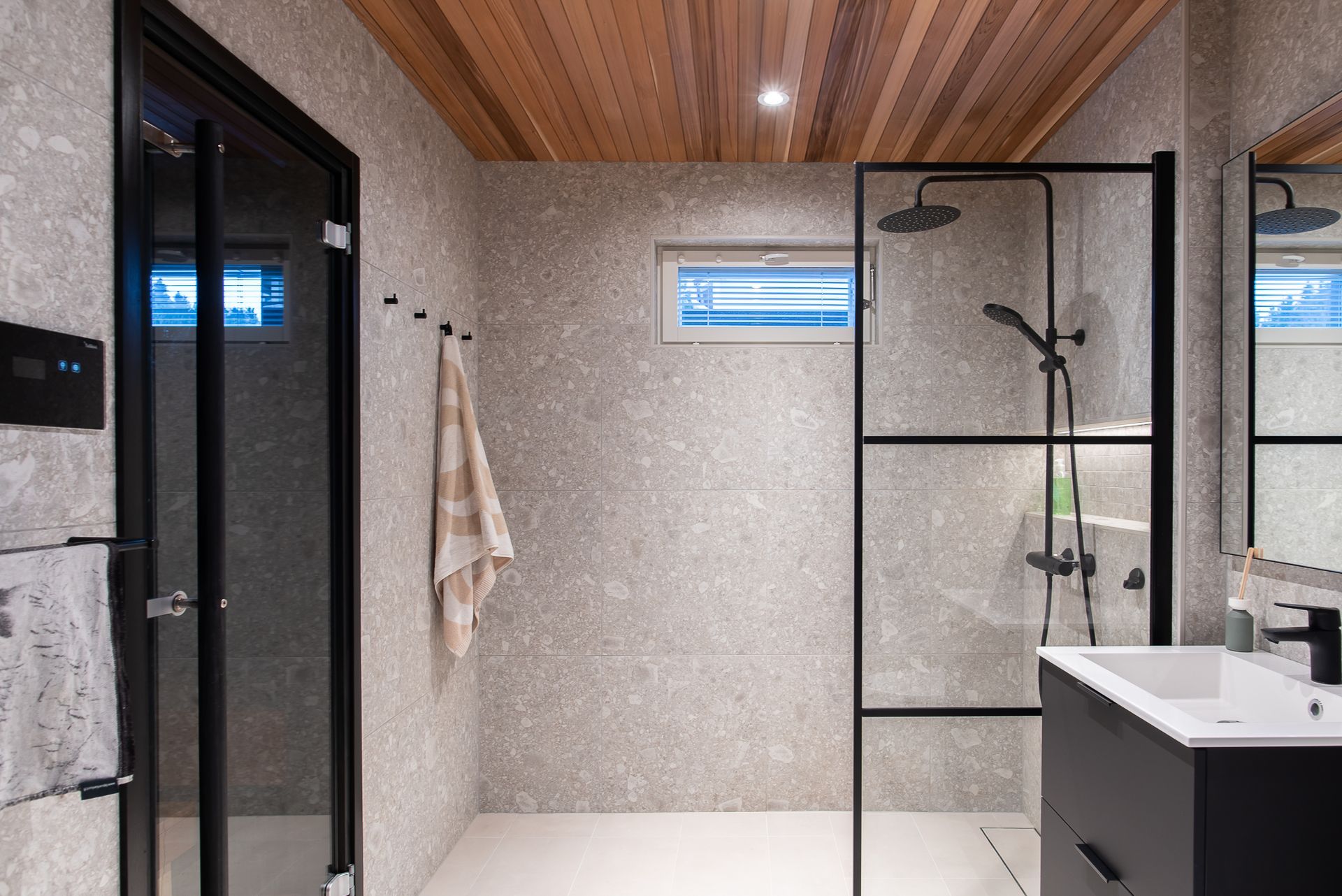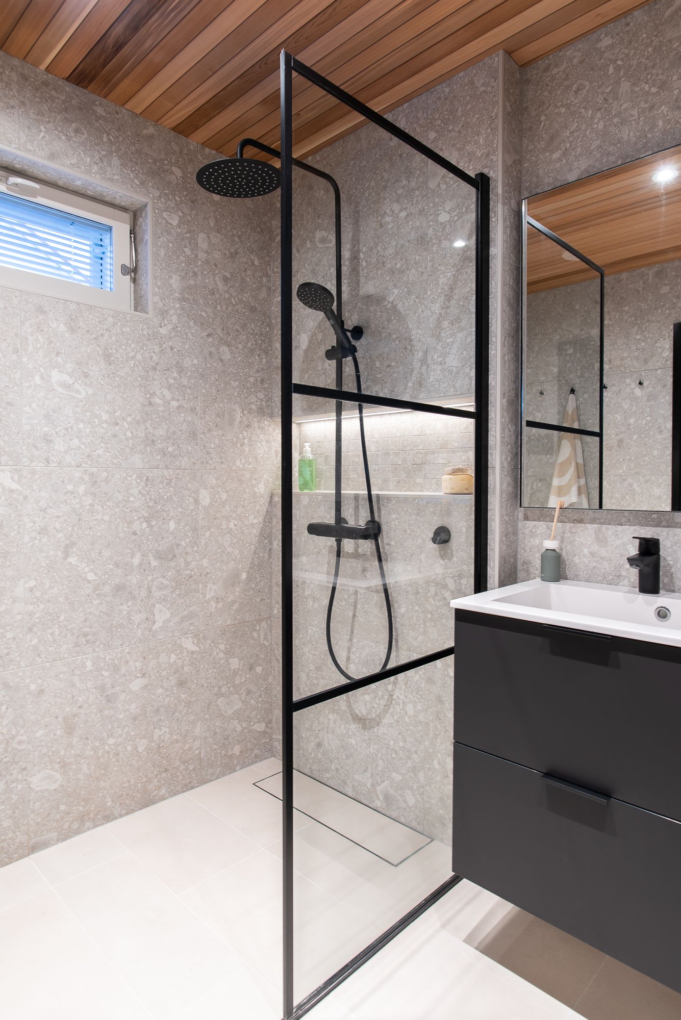 Vanhan 1900-luvun alkupuolella rakennetun puutalon kylpyhuone uusittiin täydellisesti remontissa. Toiminnot pysyivät entisillä paikoillaan, mutta tarkalla mitoituksella ja oivaltavalla kalustesuunnittelulla tilaan saatiin avaruutta ja lisää työtilaa. Rohkeat värit ja kuviot sopivat talon tyyliin ollen samalla arkea piristävä tekijä.